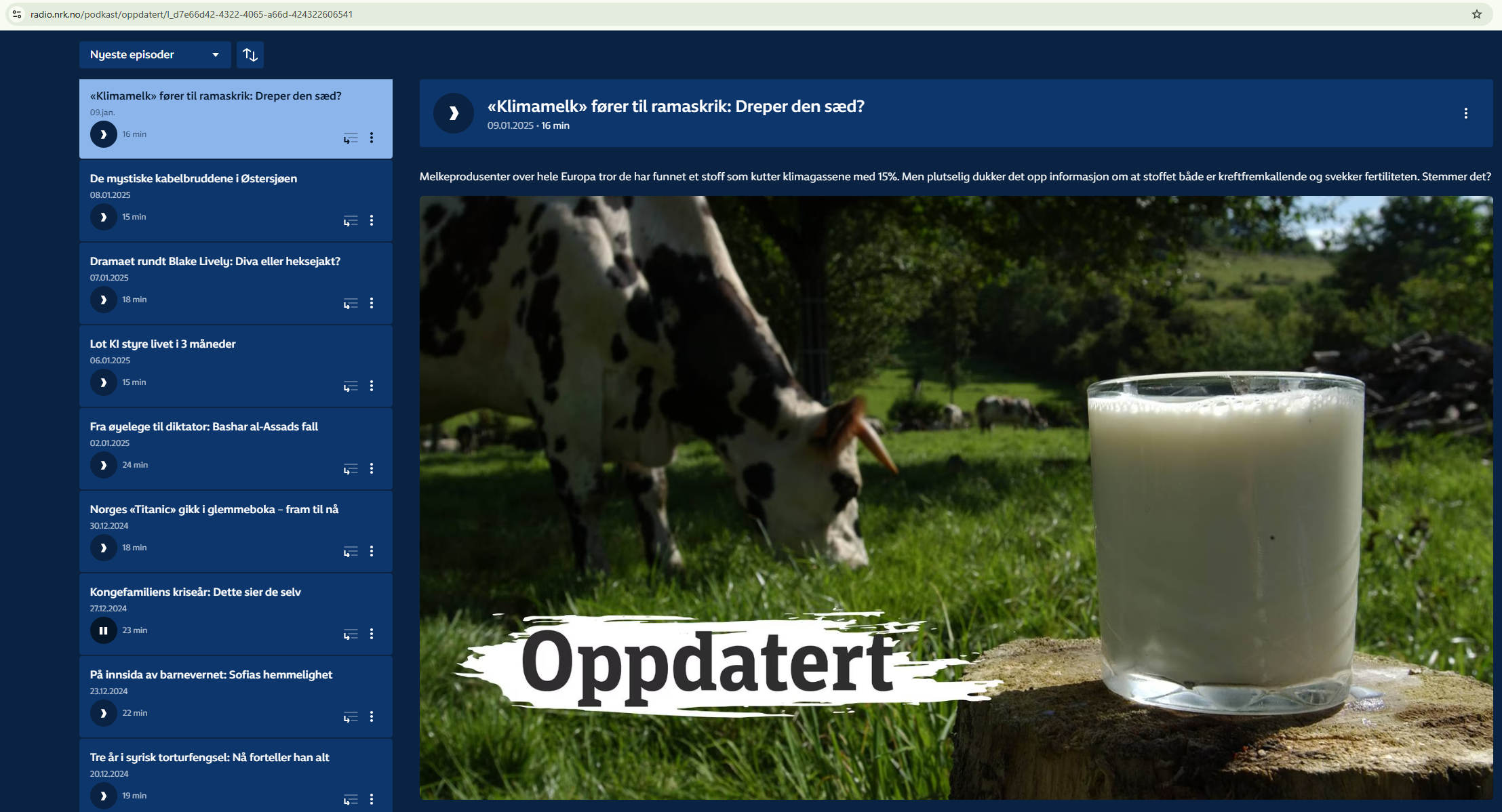 På Norsk rikskringkasting (NRK)'s podkast i januar snakker de om mediestormen rundt Bovaer i en samtale med Kajsa Garmann Lønrusten, Journalist hos Faktisk.no. Hør episoden her og les Kajsa sin artikkel her 🐄