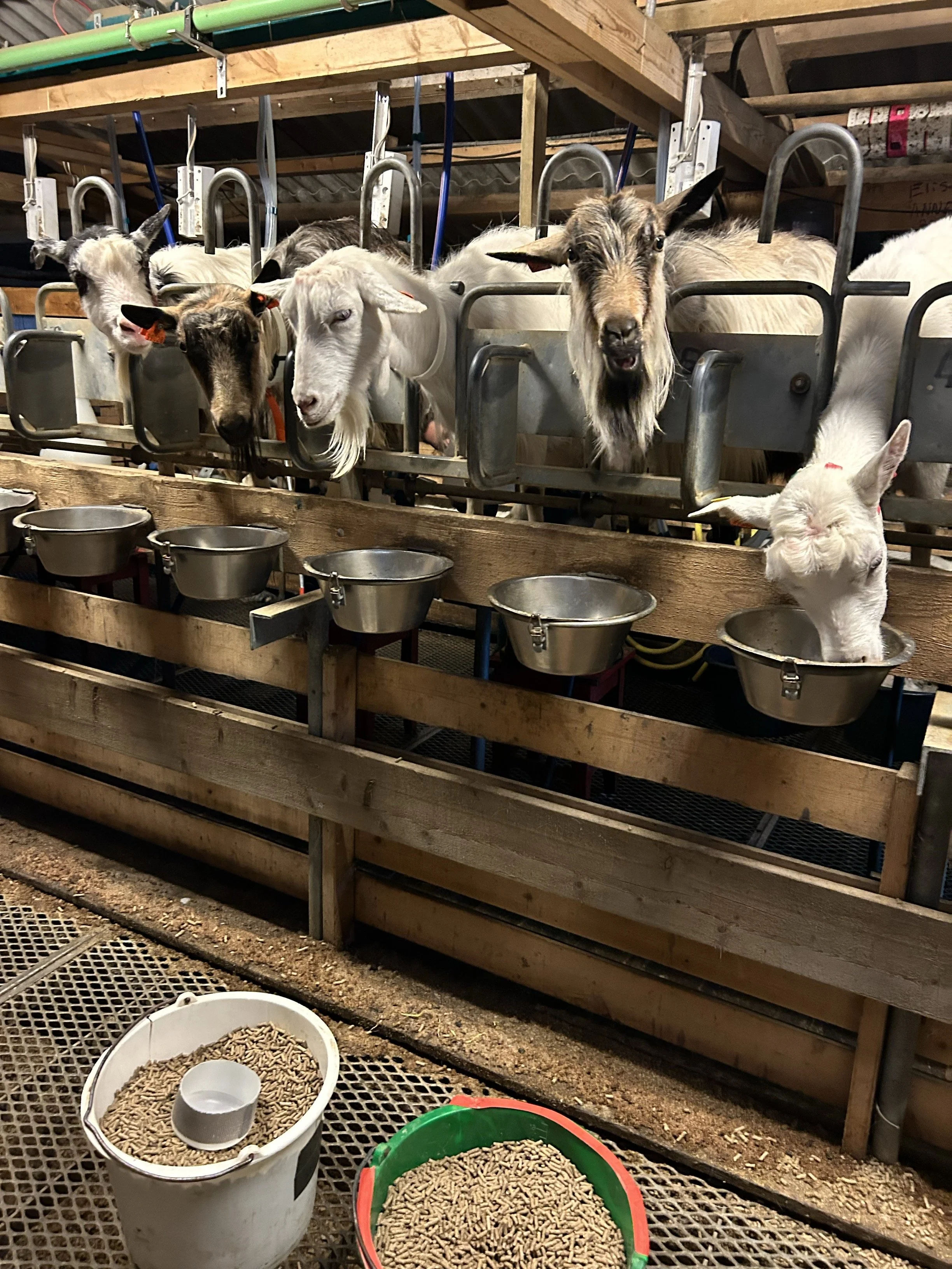 Forsøksgeitene tildeles kraftfôr med metanreduserende fôrvarer når de er inne til melking