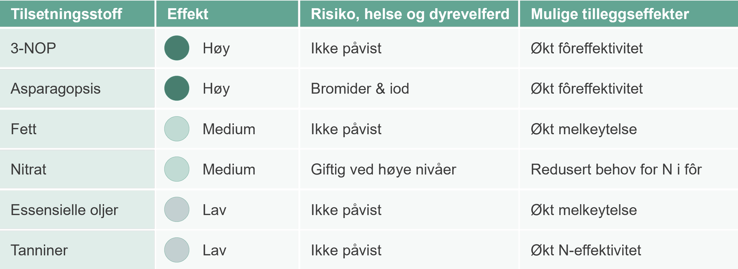 Ulike fôrvarer kan tilsettes fôret til drøvtyggerne og gi en metanreduserende effekt. Ulike fôrvarer gir ulik grad av effekt, og kan ha noe risiko ved for høy dosering (Asparagopsis og nitrat). Noen tilsetningsstoffer har også positive tilleggseffekter utover metanreduksjon.