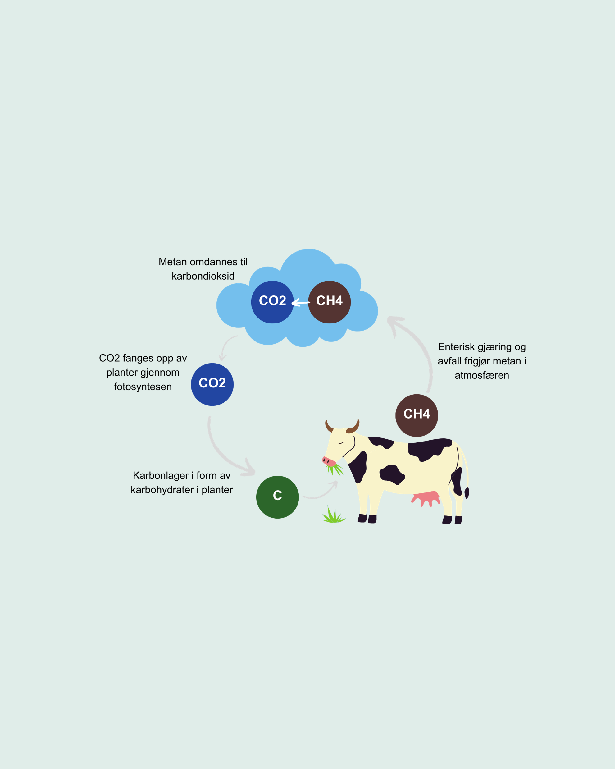 Metan har en klimaeffekt som er omtrent 80 ganger sterkere enn CO2 over en 20-års periode. I Norge står jordbruket for 56,4 prosent av det totale metanutslippet, hovedsakelig fra fordøyelsen til drøvtyggere. Selv om disse utslippene er biologiske og del av en kortere syklus enn fossile utslipp, har vi satt ambisiøse mål for å redusere metanutslipp fra drøvtyggerne for å bidra til å redusere den globale oppvarmingen.